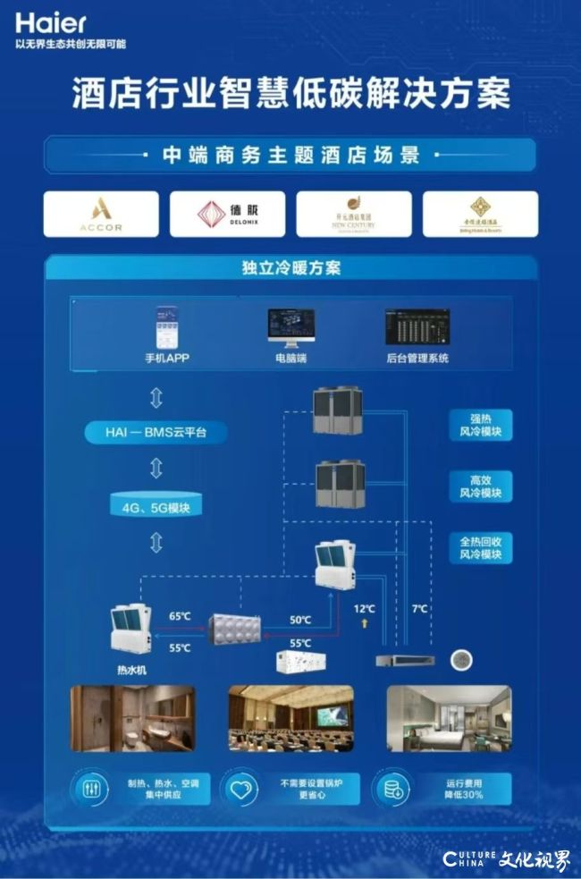 中端商务主题酒店场景适配独立冷暖方案,通过HAI-BMS云平台与4G/5G模块实现智能管控,配合不同风冷模块集中提供采暖-、热水及空调服务○,无需单独配置锅炉,可降低约30%运行成本;