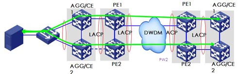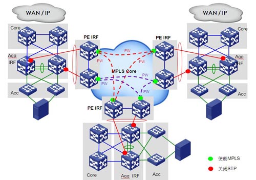 如图9所示,在这种组网方案中,以现有的MPLS网络作为核心网络••,每个数据中心配置两台交换机作为PE设备,每个数据中心的汇聚层设备作为CE设备•□。在CE和PE设备之间应用链路聚合技术,保证CE至PE之间任意节点、任意链路异常能够实现毫秒级快速切换◁▽□。同时,在简化MPLS网络的架构方面•-,该方案与VPLS+Smartlink组网方案的要求是一致的△■。