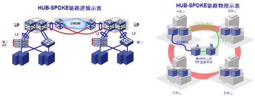 基于裸光纤或DWDM线路的二层互联方案有两种选择:HUB-SPOKE方案和RRPP环网方案。前者的优点是基于最短路径转发,所以转发效率高;后者的优点则是环网天然的转发路径冗余设计,所以HA性能较高。