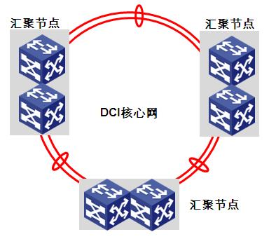 RRPP环网模型是一种更便捷的组网方式▪•,即通过RRPP环网直接将各数据中心的汇聚层互联形成一个DCI核心网(如图6所示)。