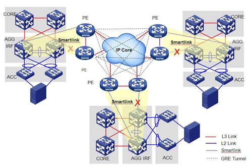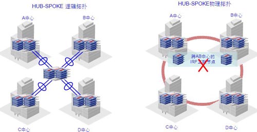 在Hub-Spoke组网环境中=◆…,核心节点是最重要的,关系到全网是否能正常运转,是保证多数据中心HA的关键因素。如何提高核心节点的HA性能?一个最重要的设计理念就是在核心节点应用IRF技术,将两台设备通过IRF技术形成一台设备,将核心设备故障异常的收敛时间从几十秒降低到毫秒级★▪◁,也就是说可以将系统的HA性能提高将近两个量级■。这一点对于Hub-Spoke组网方案是非常重要的。