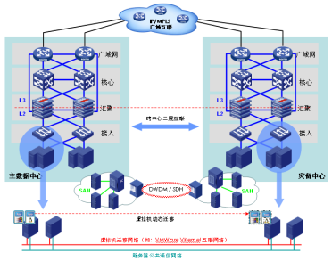 数据中心之间二层互联是为了实现虚拟机的异地调度和集群异地应用,为了实现这一点,必须满足虚拟机VMotion和集群存储异地访问的时延要求◇。第一个限制是VMotion同步会话距离。第二个要求是存储网络。DC之间的存储必须实现同步访问或是镜像访问•○☆。