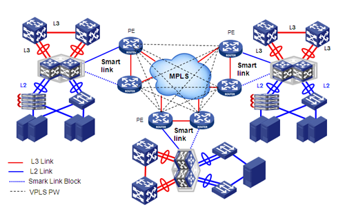 如图8所示,在VPLS+Smartlink组网方案中,以现有的MPLS网络作为核心网络☆-,每个数据中心配置两台路由器作为PE设备▷,每个数据中心的汇聚层设备作为CE设备(建议汇聚设备支持IRF)…•。在CE设备上应用Smartlink技术○▷▪,保证CE上行至PE的两条链路能够实现故障毫秒级快速切换。