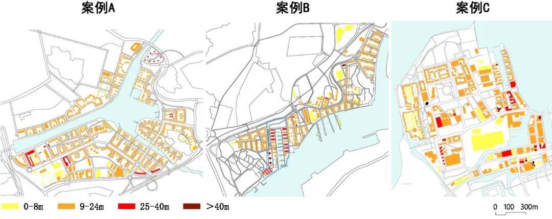 街道空间尺度与建筑环境品质对于步行的视觉体验和心理感受至关重要。3个案例都采用低层高密度加少量高层建筑的街区建设模式◇,突出半开放式的建筑组团特征。低层建筑一般3-5层高(图9),通过明晰的界面限定街道、广场与庭院空间,延续瑞典老城区密集▽▼、亲近和宜人的空间特质,整体上较为平均的建筑高度也有利于形成舒适的微气候环境,避免北欧滨水地区的寒风侵袭◇◇▷;高层办公或酒店建筑往往位于住区外围,隔离交通噪音与寒风…▽■,同时也是地区的门户形象。另外,具有历史价值的老码头建筑或构筑物被严格保留下来,并融入公共环境设计中=◇。例如,案例B的老船坞巨型门式塔吊与周边的新建筑相互辉映,形成特色鲜明的滨水天际线△,展现具有活力与魅力的后工业景象。