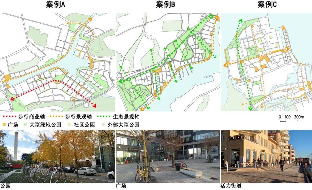 3个案例都充分发挥了水资源的生态景观与休闲娱乐价值▽■△,使滨水区成为整个公共空间体系的重心▪□○,并且与绿地公园、广场、活力街道等不同类型的公共空间相互连接成为一个整体(表5=◆-,图8)▪…=,满足居民休憩、散步、健身以及交流等活动的需求,提升了整个地区的步行环境品质。