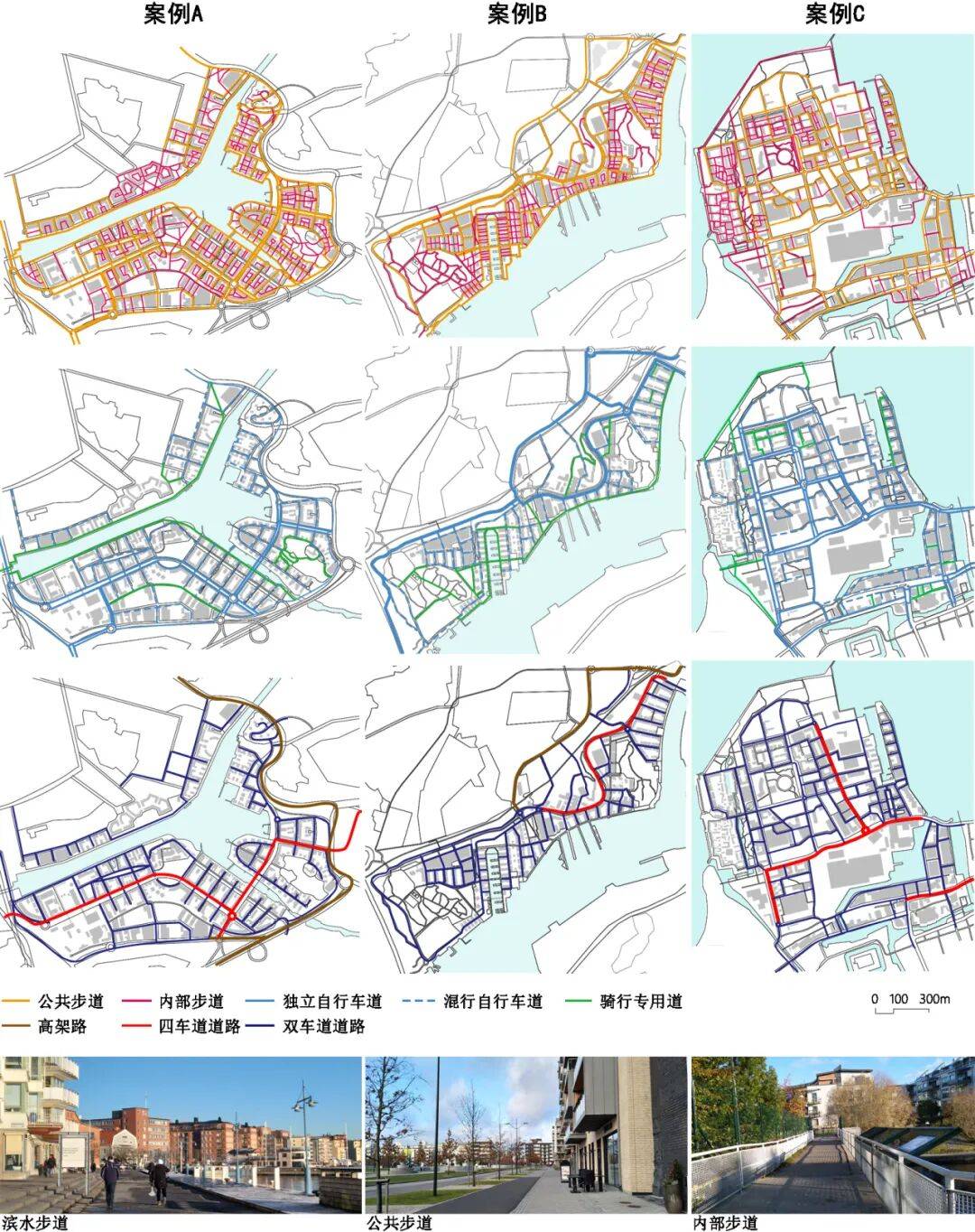 3个案例都拥有密集而连续的步行路网(密度在28-36km/km²之间)与自行车路网(密度在14-18km/km²之间)。其中◆,步行路网由公共步道与内部步道组成(图2)。公共步道指滨水步道与街道人行道,内部步道指开放建筑组团或绿地公园内部的步径●□=,不受车行干扰△,环境清静宜人…,为居民提供多样化的路径选择☆=▼。