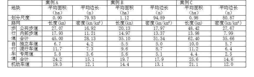 自行车路网由独立路权的车道☆▲、与机动车混行的车道和穿梭在(滨水)绿地公园中的专用车道组成,能够满足居民不同的骑行需求。机动车的路网密度在12-13km/km²之间,将基地划分成尺度适中的街区地块,平均面积在0.9-1.1ha之间(表1),这可以形成更多的道路交叉口,有利于降低汽车车速●△。
