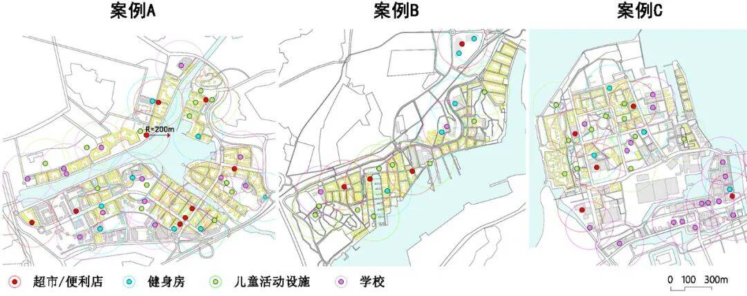 居民日常使用的社区服务设施(如学校、超市、健身房以及儿童活动场等)分布均衡•-,如果以200m为服务半径,基本上覆盖各个生活组团(图7)▷。同时,将重要的公共建筑、社区服务设施与公共交通站点进行协同布局。例如,案例A的商业服务设施主要分布在电车交通廊道的两侧,店面连续且密集,居民在交通换乘时即可进行顺路消费活动,是该地区商业气氛最浓厚的街道。