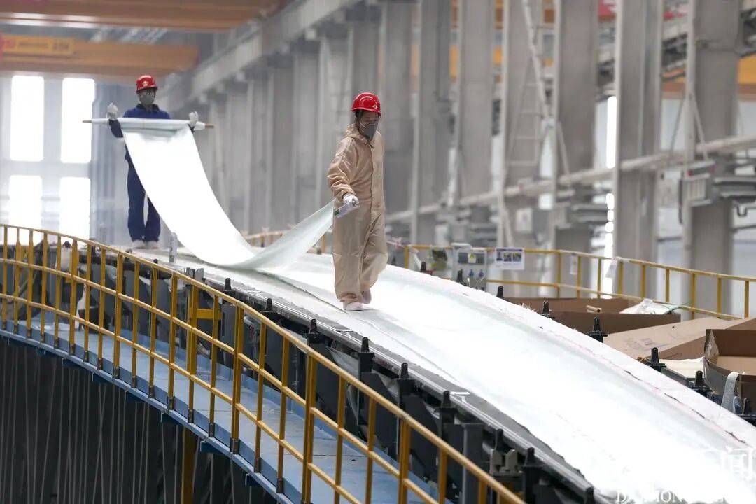 12月15日,中船集团七二五所东营双瑞风电叶片有限公司生产车间内,工作人员正在生产风电叶片。(裴滨滨 摄)