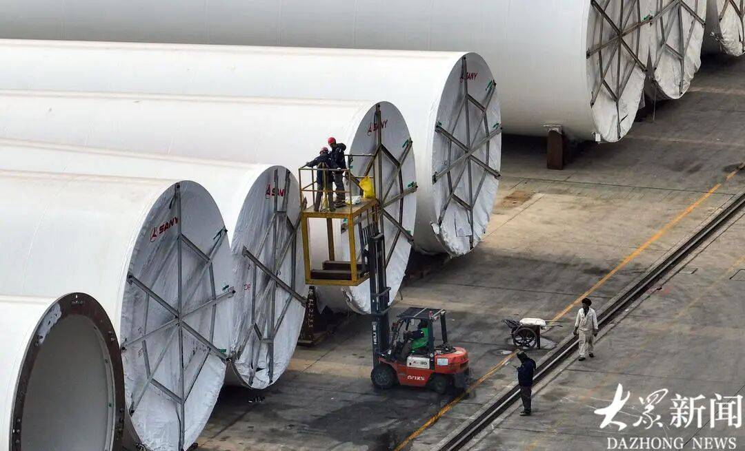 12月16日,海力风电设备科技(东营)有限公司工作人员对塔筒进行转运作业。