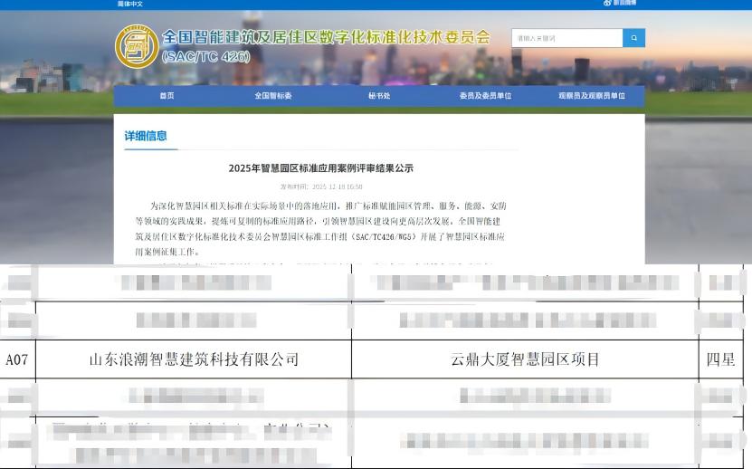 近日◆▷,全国智能建筑及居住区数字化标准化技术委员会(SAC/TC426)(简称▽☆“全国智标委”)官网公示了2025年智慧园区标准应用案例评审结果▼★,山东浪潮智慧建筑科技有限公司申报的云鼎大厦智慧园区项目经单位申报•…、材料初审▷▽•、线上答辩、终审评定等程序,成功入选2025年智慧园区标准应用案例。