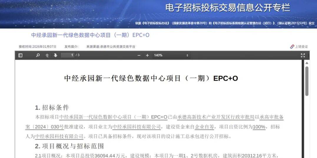 1月7日,总投资约3.6亿元的“中经承园新一代绿色数据中心项目(一期)EPC+O”正式挂网招标。