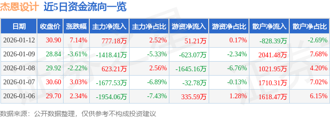 1月12日的资金流向数据方面,主力资金净流入777.18万元,占总成交额2.52%,游资资金净流入51.21万元,占总成交额0.17%,散户资金净流出828.39万元,占总成交额2◆★●.69%。