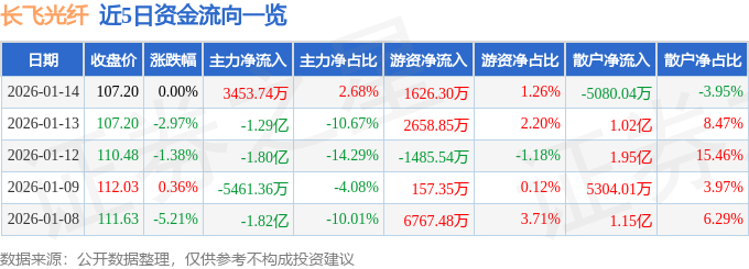证券之星消息◇-,截至2026年1月14日收盘•■,长飞光纤(601869)报收于107◆□▪.2元△,上涨0.0%△…,换手率2.95%,成交量11.98万手,成交额12.88亿元。
