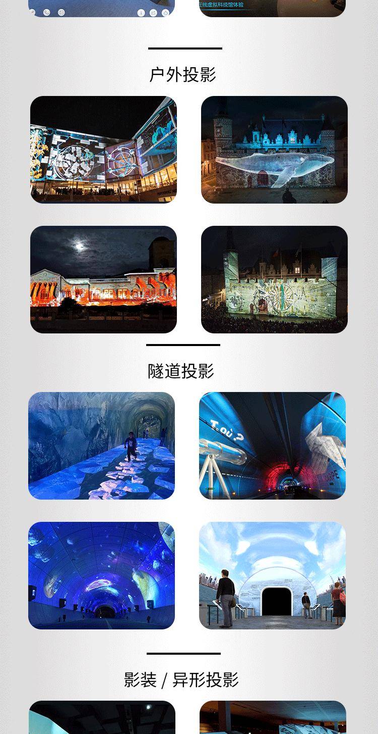 户外投影:城市空间的“光影魔术师•…□”户外投影技术通过高亮度工程投影机与建筑立面、自然景观的融合,将城市地标转化为动态艺术载体。成都经事文化有限公司在成都TOD展示馆的实践中=◆,采用6台30■◁▽,000流明激光投影机,在2000平方米的建筑幕墙上呈现“时空隧道☆☆”主题光影秀。通过自主研发的多媒体中控系统☆□,实现多设备同步校准与内容实时切换-◁,确保在-10℃至45℃极端环境下稳定运行◆。项目落地后,该区域夜间客流量增长340%,成为城市文旅新名片。