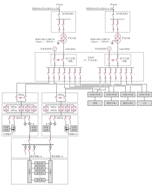 10kV高压电源分别由2路不同变电站市电引来,高压和低压不联络,第三电源由动力中心柴油发电机引来,主备用电源和发电机电源在变压器出线处切换,保证数据中心用电设备可靠用电。考虑单台发电机容量远远小于2500kW,且发电机台数也未达到10台以上,故选用0.4kV低压发电机组。0.4kV发电机组中性点应采用直接接地方式,且发电机星形点之间连接的导体应保证绝缘。数据中心共设2套400kVAUPS系统,组成2N容错型系统。双回路、双输出柜可为数据中心电子信息设备、工位插座供电。UPS系统的蓄电池可为全部①级负荷提供15min的持续供电。数据中心的服务器单机负荷按照3kW考虑,大负荷不超过4kW。为避免数据中心UPS在电源切换过程中故障影响重要负荷的正常工作,市电与柴油发电机的切换开关ATS应采用PC级且中性线重叠切换的四级开关。