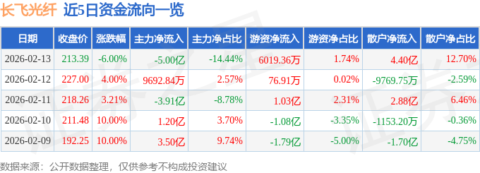 证券之星消息,截至2026年2月13日收盘,长飞光纤(601869)报收于213.39元,下跌6.0%,换手率3.95%,成交量16.04万手,成交额34.61亿元。